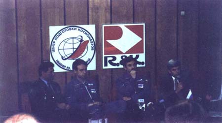 The press conference with Sergy Zalyutin and Alexander Kaleri who returned from Mir just two days previously. Who are the guys flanking them?