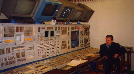 Control room for the Soyuz simulator. On the right side of the console are patches from American and Russian missions.