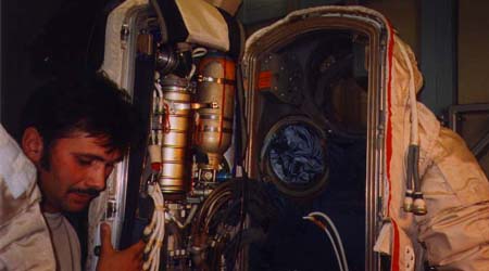 This is a better picture of the workings of the Orlan-M suit. You don't put the suit on, you enter it.
